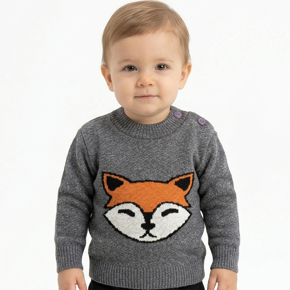 Blusa de Raposa Tricô Kids Trança Canelado feito em tecido algodão e acrílico, gola redonda, estampa frontal, manga longa e etiquetas personalizadas.