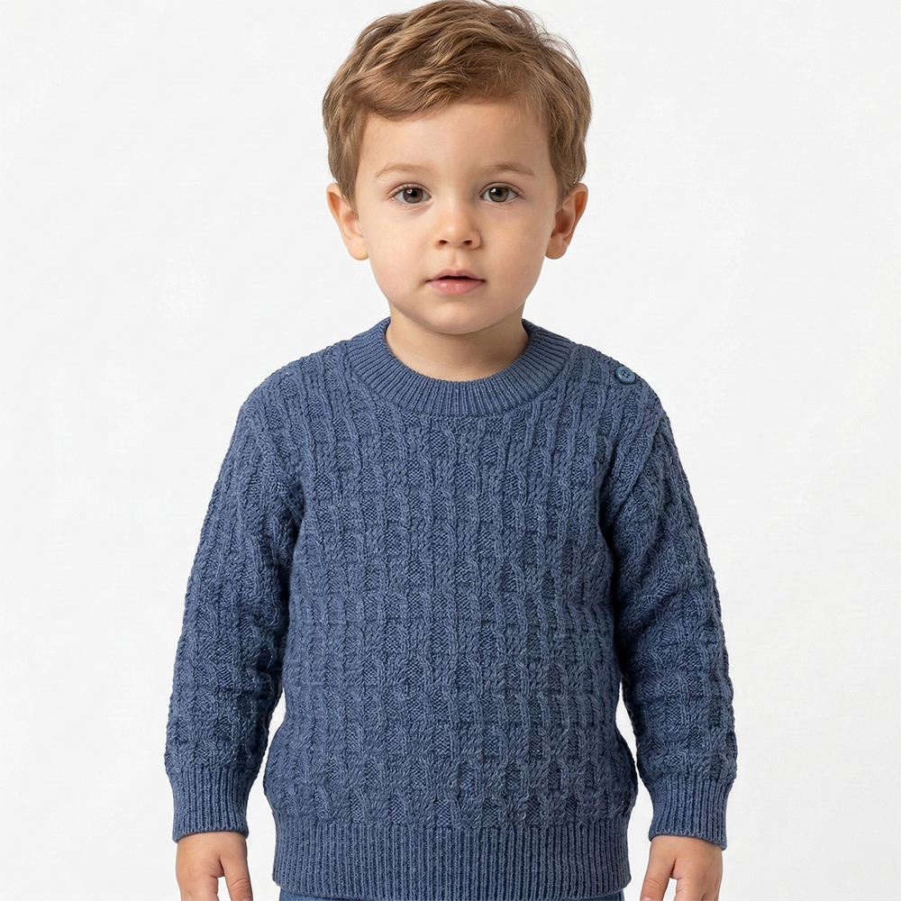 Blusa Trabalhada Tricô Kids Ombro Botão feito em tecido algodão e acrílico, gola redonda, manga longa e etiquetas personalizadas.