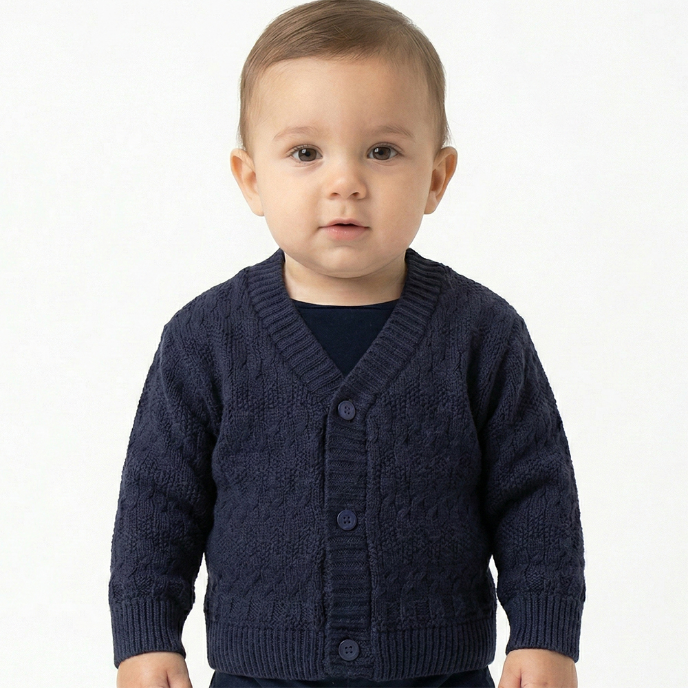 Casaco de Trabalhado Tricô Kids Tranças feito em tecido algodão e acrílico, gola em V, fechamento em botões, manga longa e etiquetas personalizadas.