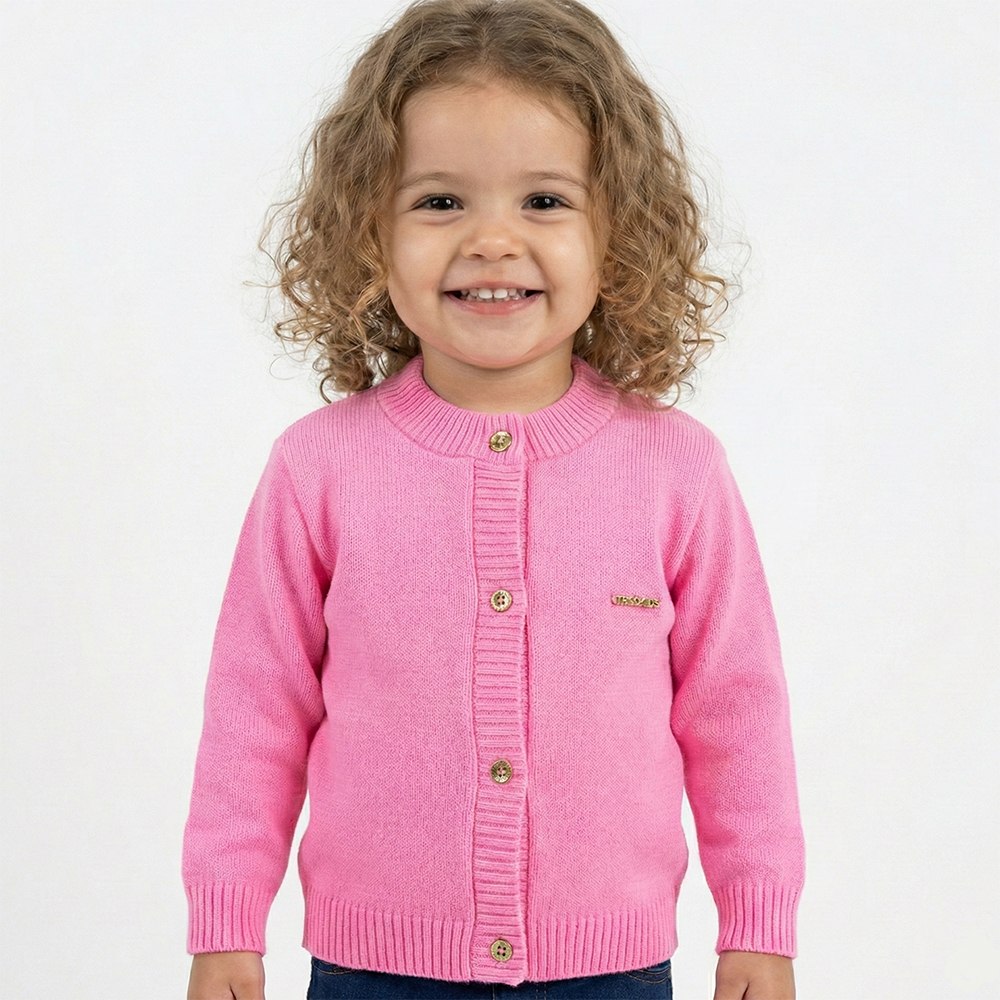 Casaco Liso Tricô Kids feito em tecido acrílico, gola redonda, detalhe em metal Tricô Kids no peito lateral, fechamento em botões, manga longa e etiquetas personalizadas.