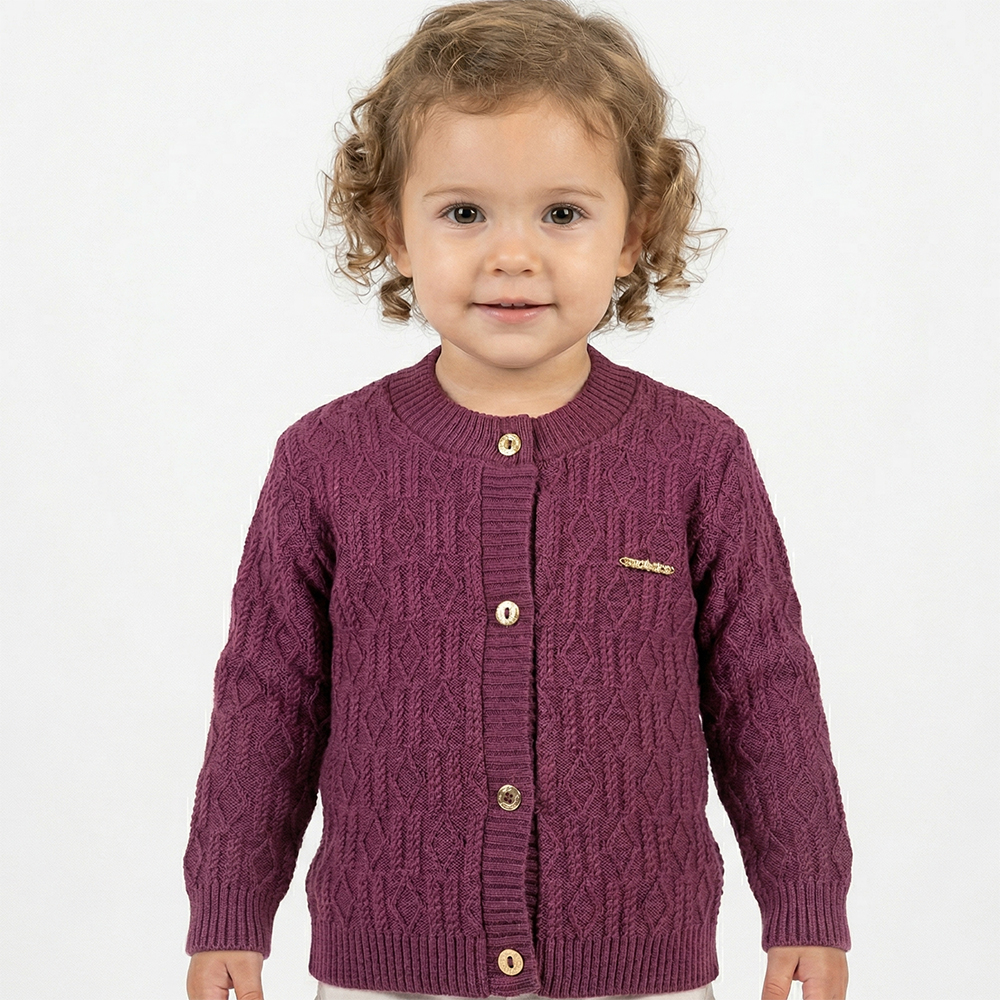 Casaco Losango e Trança Tricô Kids feito em tecido algodão e acrílico, gola redonda, Tricô Kids em dourado no peito, fechamento em botões, manga longa e etiquetas personalizadas.