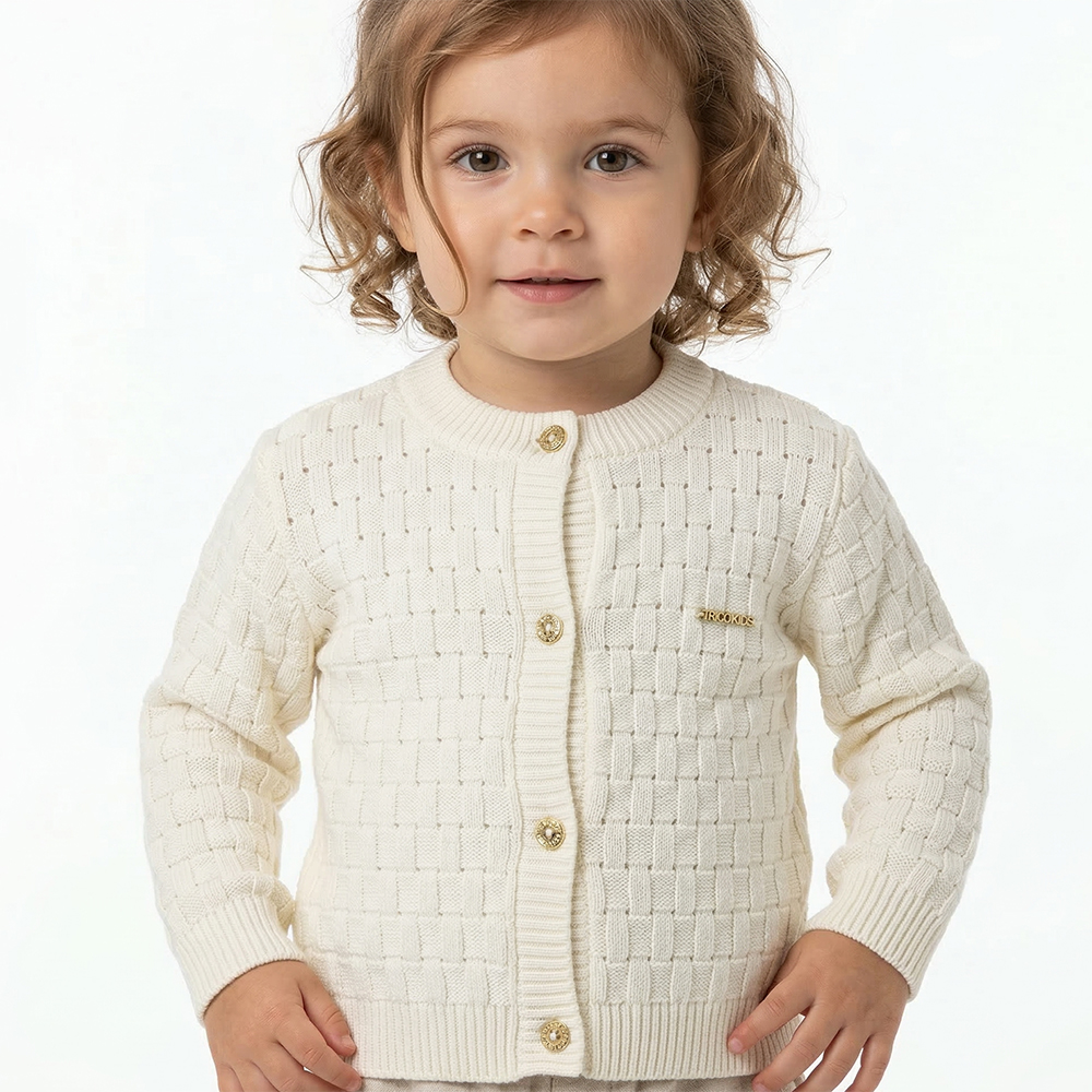 Casaco Transpassado Tricô Kids feito em tecido algodão e acrílico, gola redonda, Tricô Kids em dourado no peito, fechamento em botões, manga longa e etiquetas personalizadas.