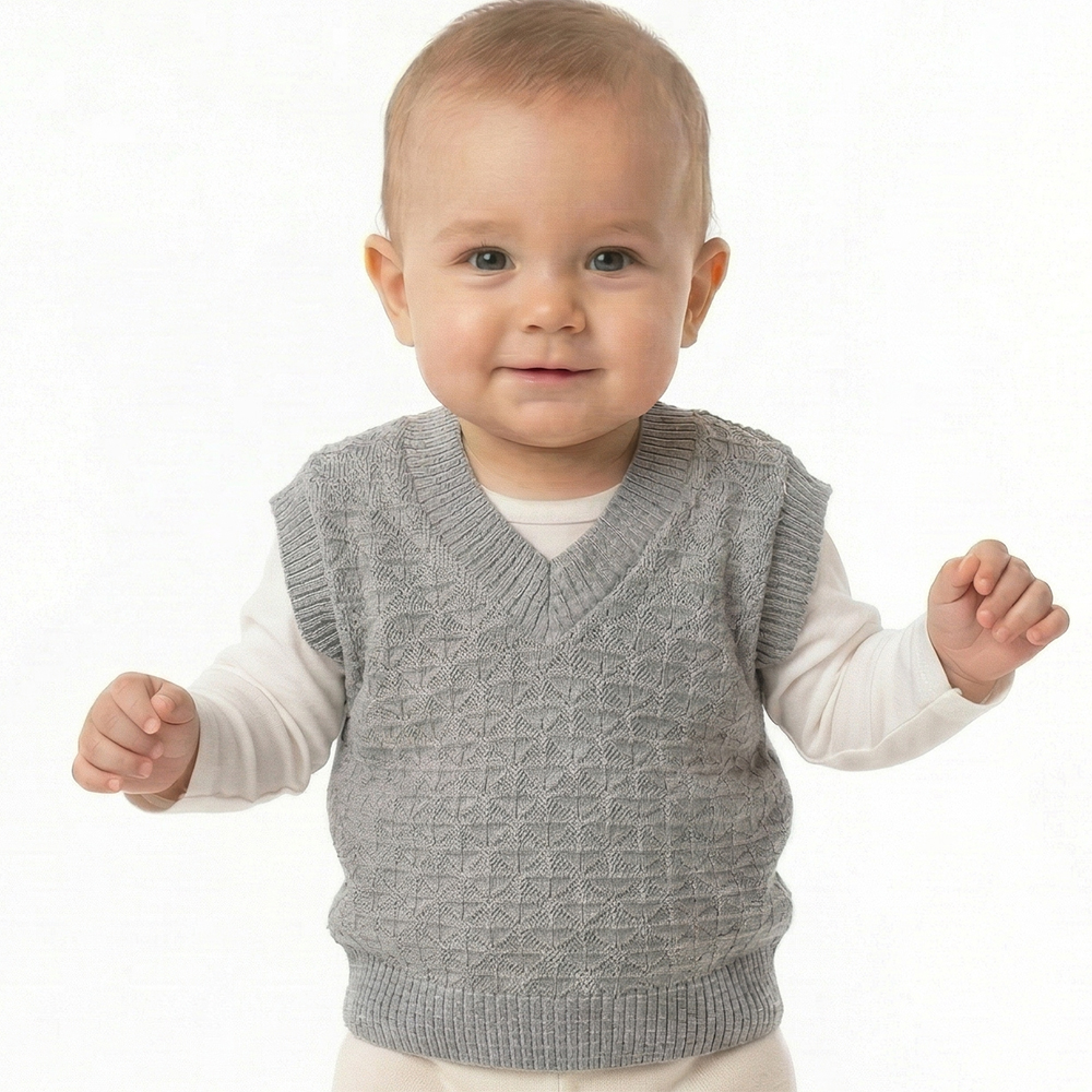 Colete de Quadriculado Tricô Kids Trabalhado feito em tecido algodão e acrílico, gola em V, estampa quadriculada e etiquetas personalizadas.