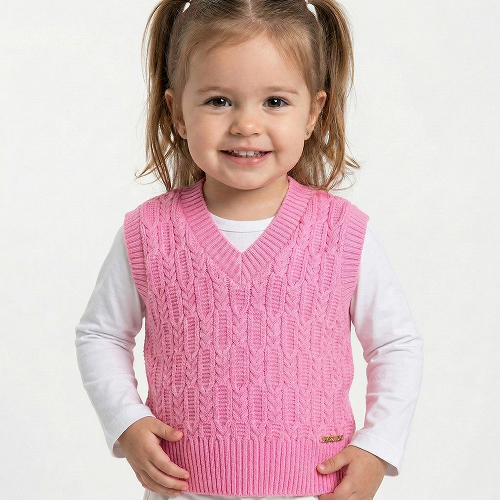 Colete Trabalhado Tricô Kids feito em tecido acrílico, gola redonda, detalhe em metal Tricô Kids na parte inferior frontal, manga longa e etiquetas personalizadas.
