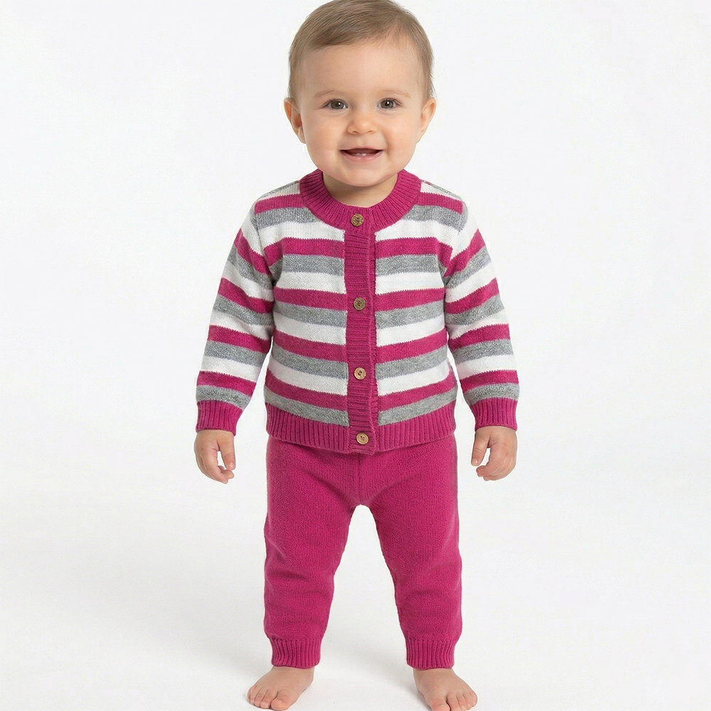 Conjunto Casaco e Calça Tricô Kids Listrado feito em tecido algodão e acrílico, gola redonda, fechamento em botões, manga longa e etiquetas personalizadas.