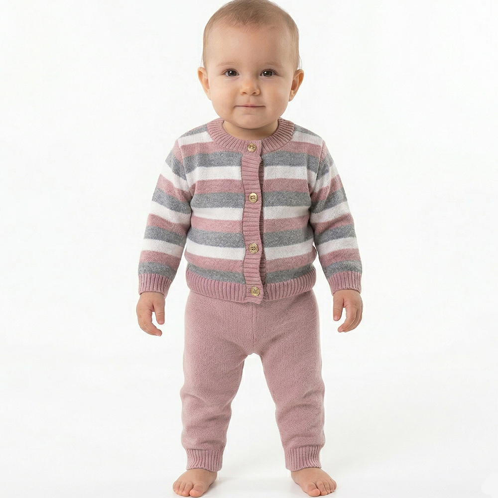 Conjunto Casaco e Calça Tricô Kids Listrado feito em tecido algodão e acrílico, gola redonda, fechamento em botões, manga longa e etiquetas personalizadas.