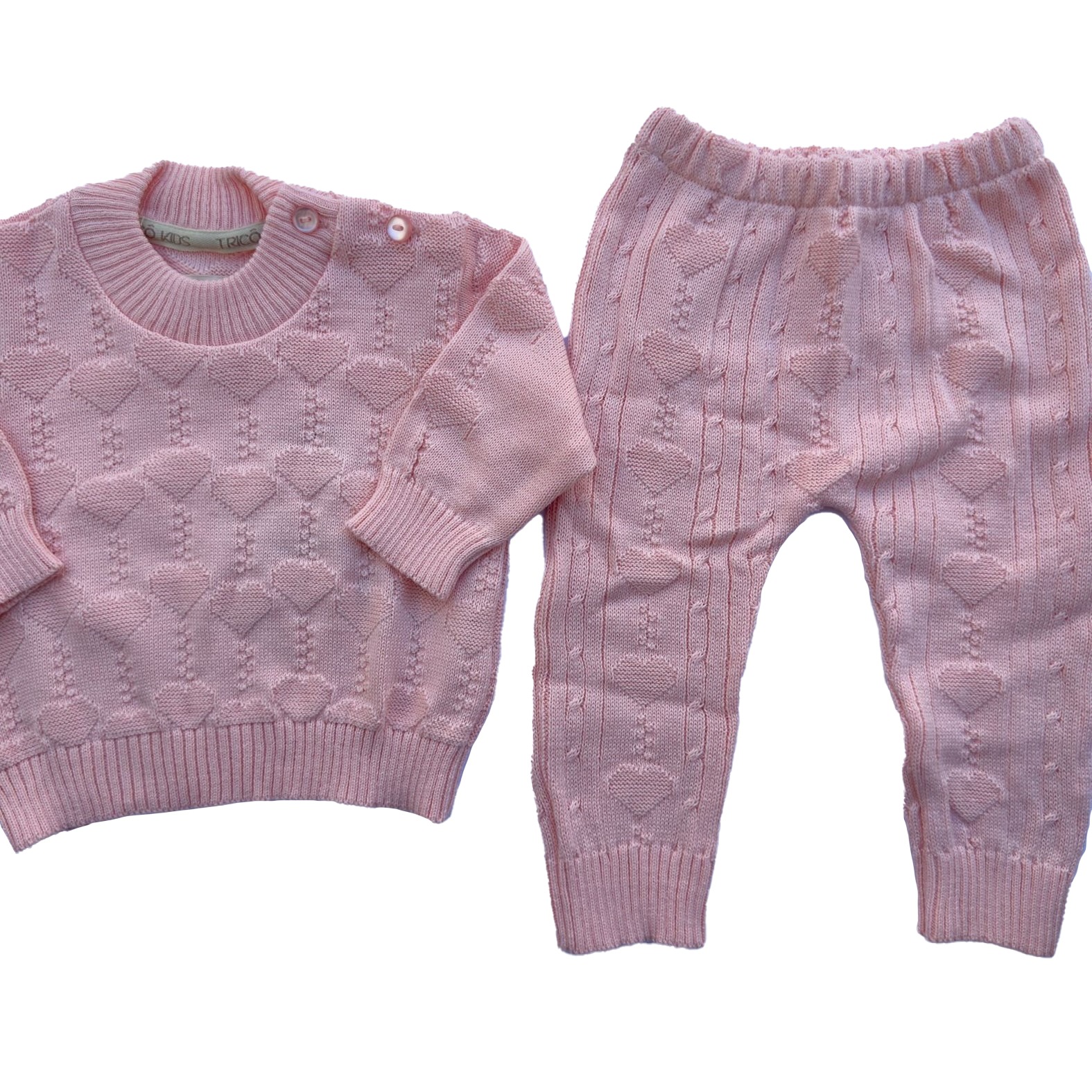 Conjunto de tricô em corações, nosso modelo Maya chegou para arrancar suspiros da mamãe, disponível em três cores ele é perfeito para acompanhar o baby no passeio na casa da vovó, visita ao pediatra, passeio em família ou em qualquer outro lugar que você prefira estar.