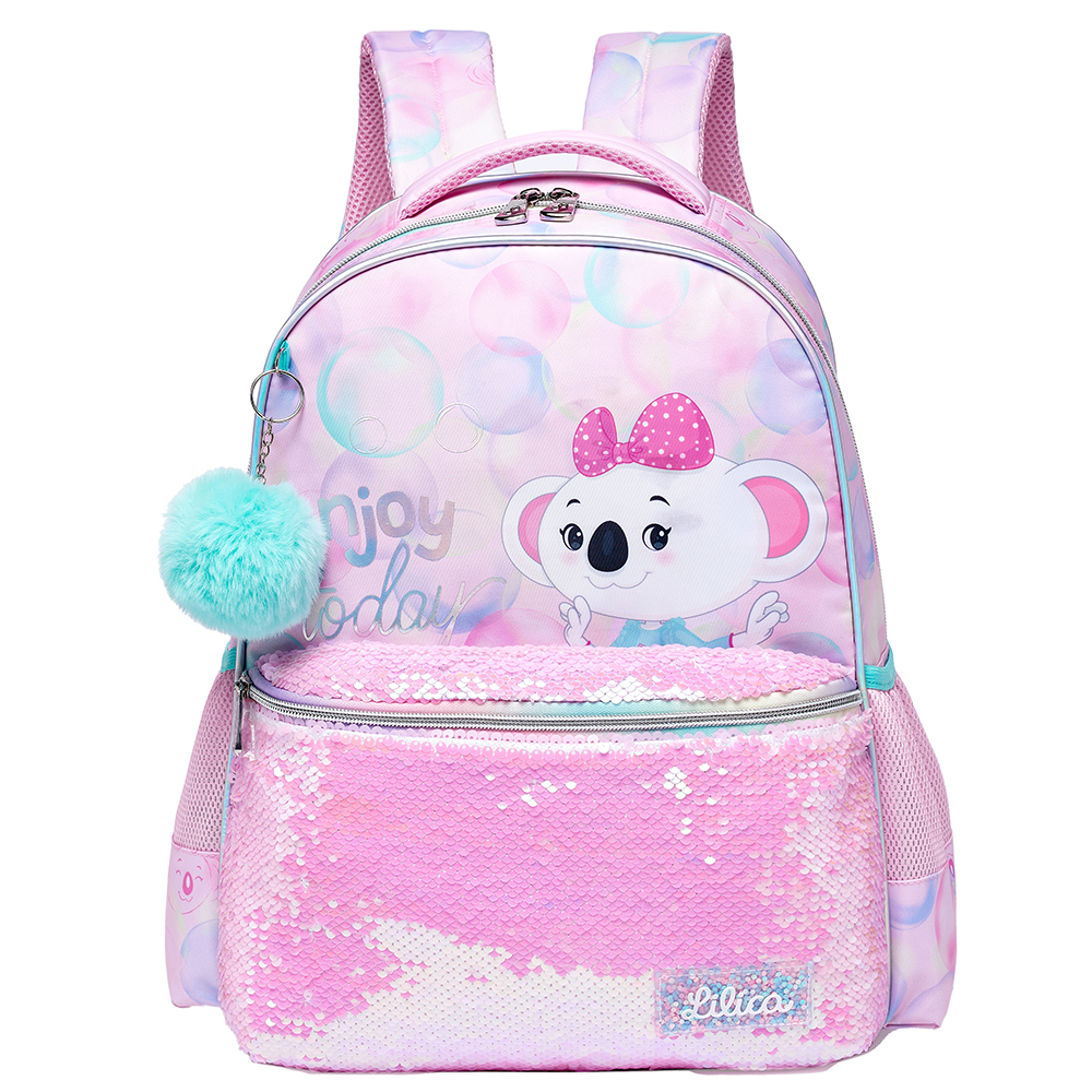 Mochila Lilica juvenil, que conta com estampa frontal, bolso frontal, telinha lateral, compartimento grande com fechamento em zíper e etiquetas personalizadas.