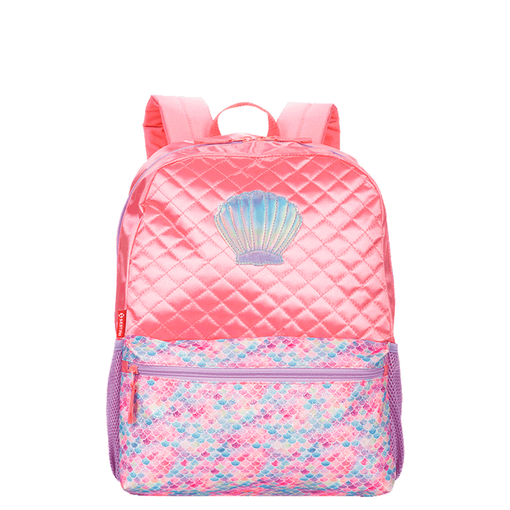 Inspirada nos elementos do fundo do mar e coberta com um rosa cintilante, a mochila da Sereia tem um bolso frontal colorido, com textura de glitter que lembram escamas, além de uma concha holográfica. Os puxadores do zíper tem reforço em cadarço e o compartimento principal conta com espaço de sobra para a pasta de atividades e os materiais escolares.