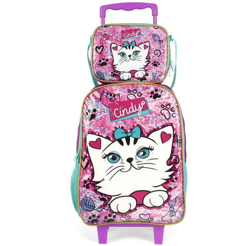 Kit Mochila De Rodinha Carrinho Gata Cindy Rosa + Lancheira - luxcel