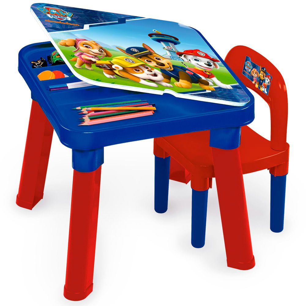 A Mesa Com Cadeira da Patrulha Canina ajuda o desenvolvimento do aprendizado da crianca de forma divertida A tampa da mesa abre revelando um compartimento para guardar objetos; e os pes desmontam facilitando o transporte do produto Acompanha cartela de adesivos para personalizar sua mesa e cadeira